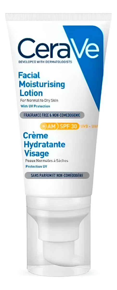 Cerave Loción Hidratante Visage SPF 30 AM 52ml es una crema facial de uso diario que combina hidratación prolongada y protección solar de amplio espectro SPF 30. Formulada con ceramidas esenciales y ácido hialurónico, ayuda a mantener la barrera cutánea mientras protege frente a los rayos UVA y UVB. Ideal para piel normal a seca.