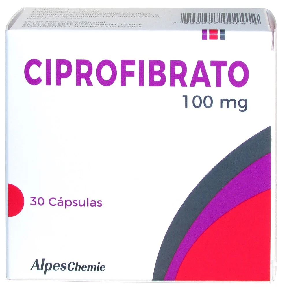 Ciprofibrato 100 mg de Alpeschemie es un agente hipolipemiante indicado para reducir niveles elevados de triglicéridos y colesterol. Presentación en cápsulas, caja por 30 unidades. Uso bajo prescripción médica.