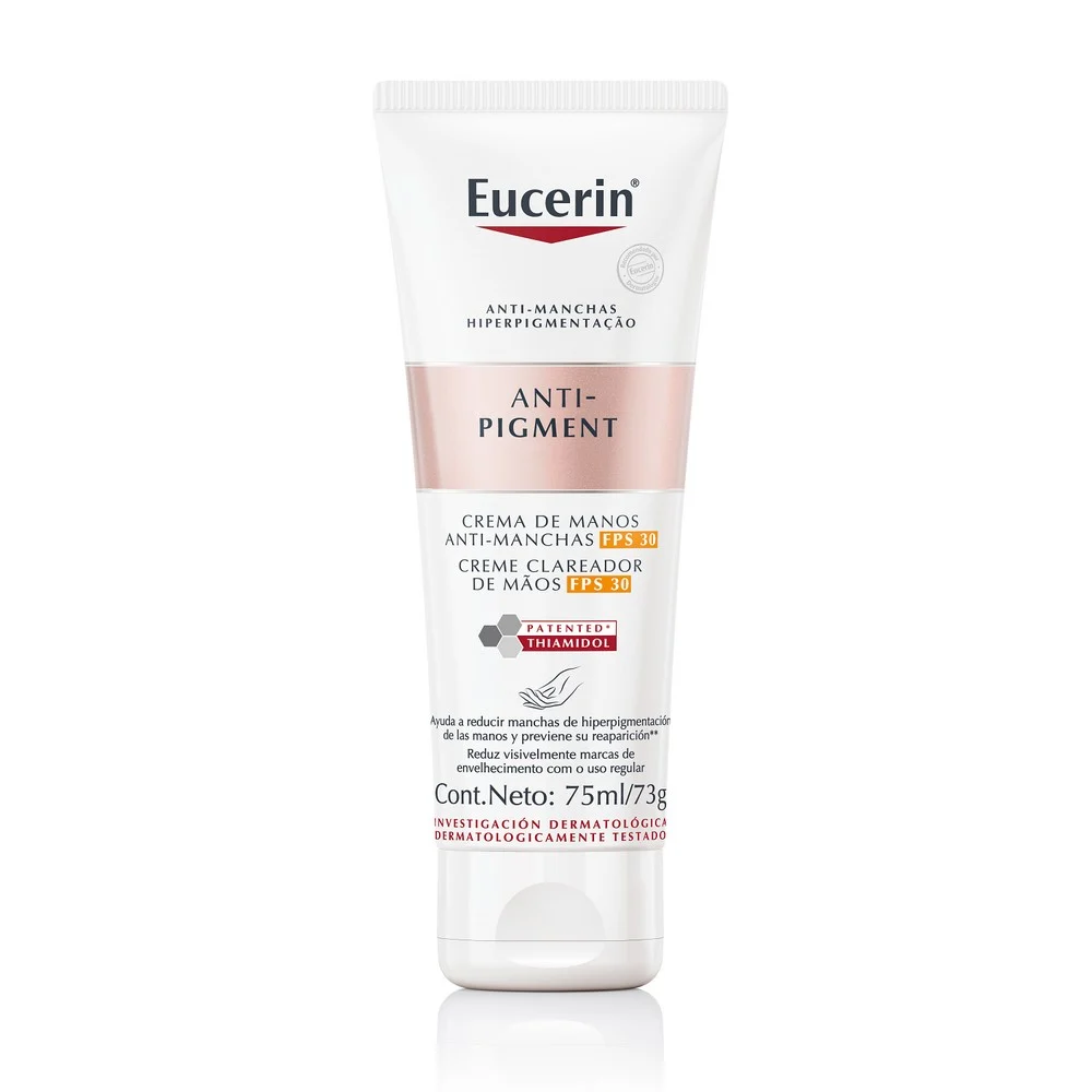 Eucerin Anti-Pigment Manos FPS 30 es una crema despigmentante de uso diario que reduce visiblemente las manchas y protege la piel de las manos con filtros solares UVA/UVB.