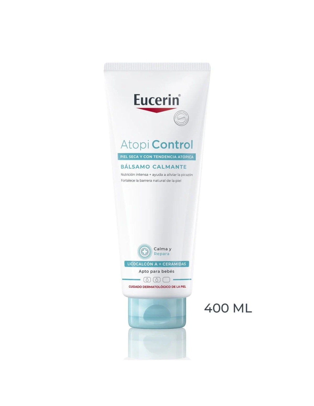 Eucerin AtopiControl Bálsamo hidrata intensamente y calma la piel atópica. Su fórmula restaura la barrera cutánea, alivia el picor y reduce la sequedad. Ideal para uso diario. Presentación de 400 ml.