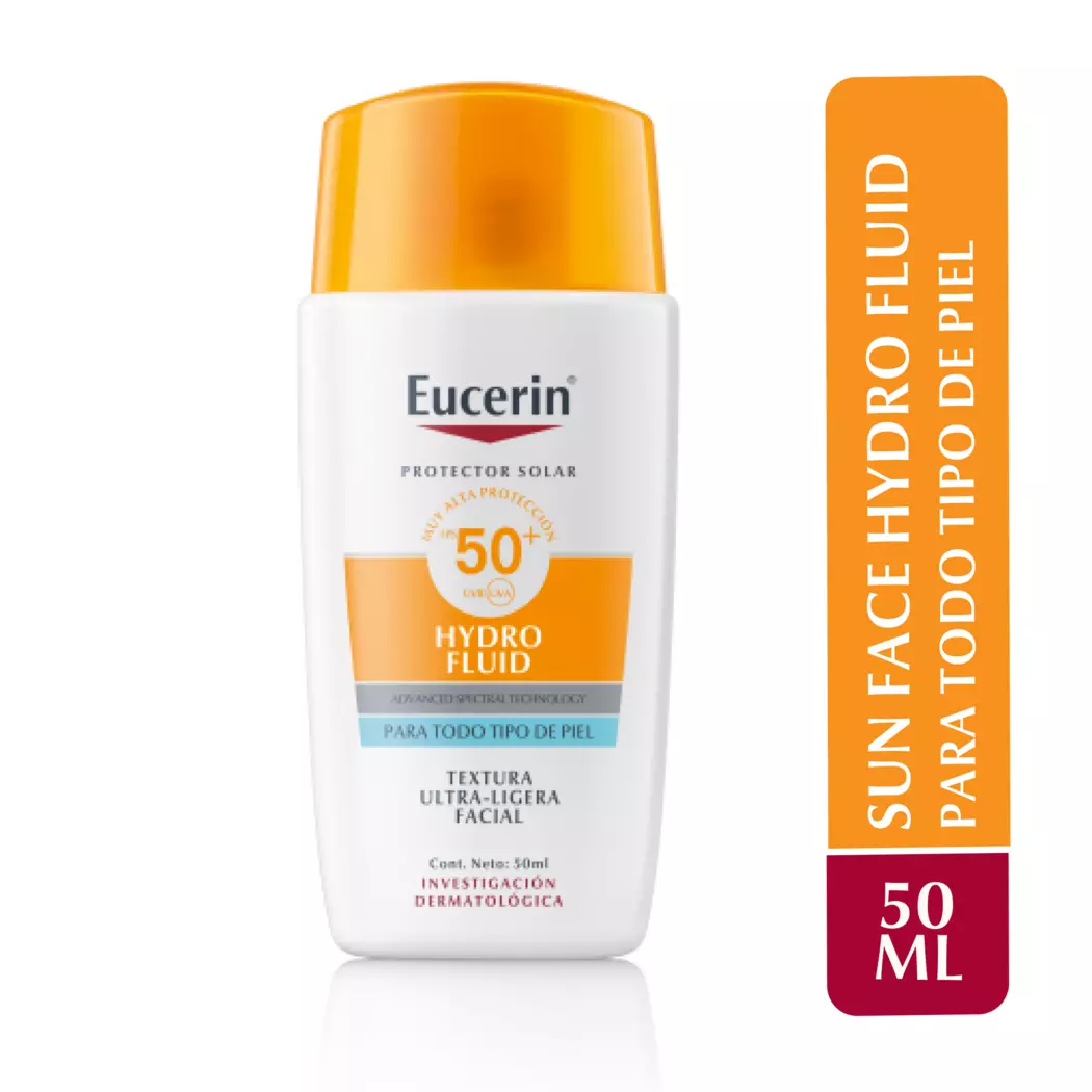 Eucerin Sun FPS50 Hydro Fluid tono claro protege contra los rayos UVA/UVB mientras unifica el tono facial. Textura ultraligera, ideal para uso diario en pieles sensibles.