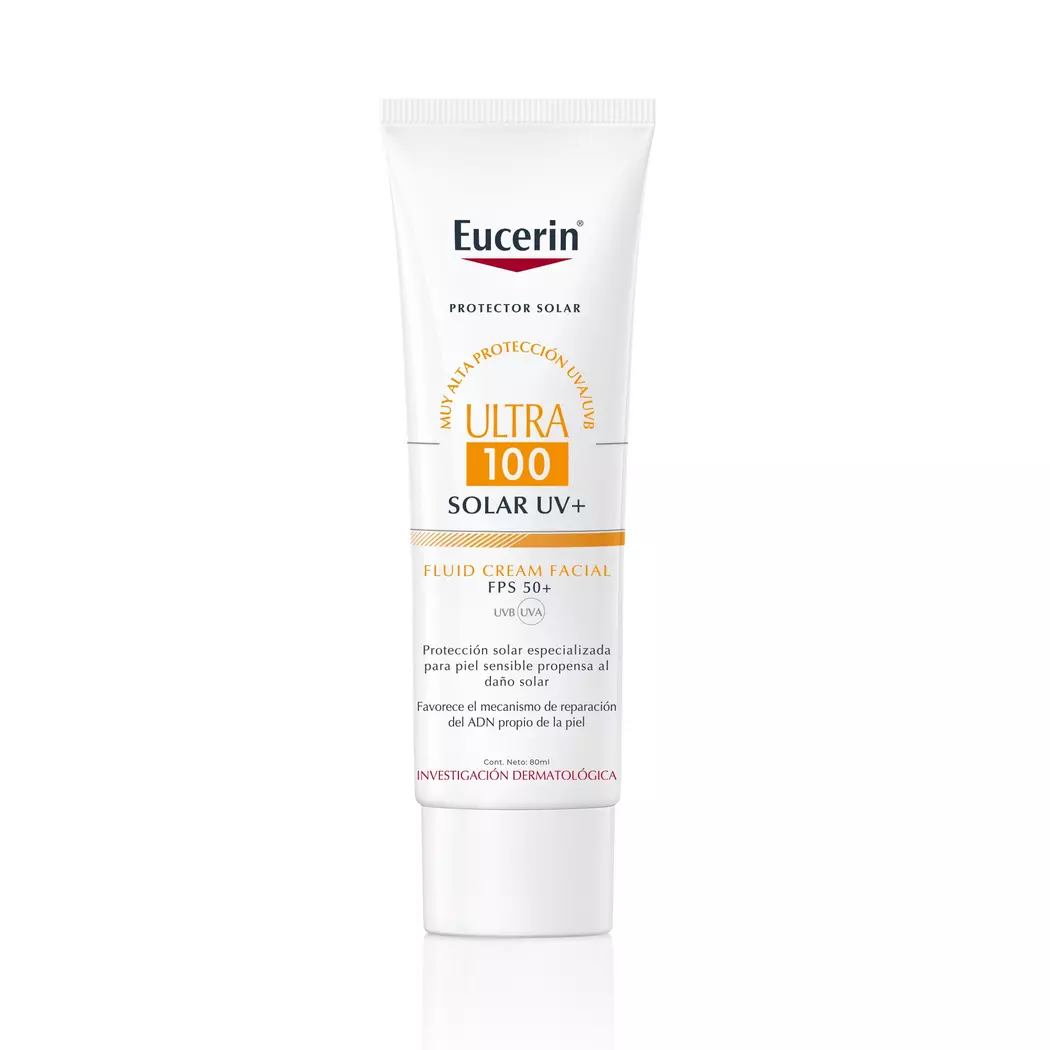 Eucerin Ultra 100 Fluid Cream Facial FPS50+ ofrece máxima protección UV para piel muy sensible o fotosensible. Textura fluida, no grasa, ideal para uso diario