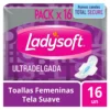 Toallas femeninas LADYSOFT moradas – paquete de 16 unidades, diseñadas con tecnología ultradelgada, núcleo absorbente y cubierta de tela suave para confort diario. Brindan protección y frescura durante el uso.