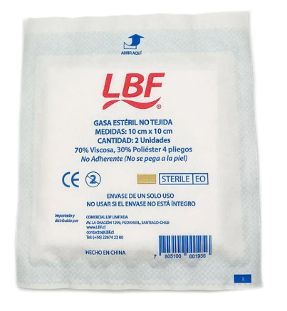 LBF gasa no tejida 10×10 cm – pack de 2 unidades, estériles y de alta absorción. Diseñadas para limpieza, protección y curación de heridas en primeros auxilios y procedimientos médicos.