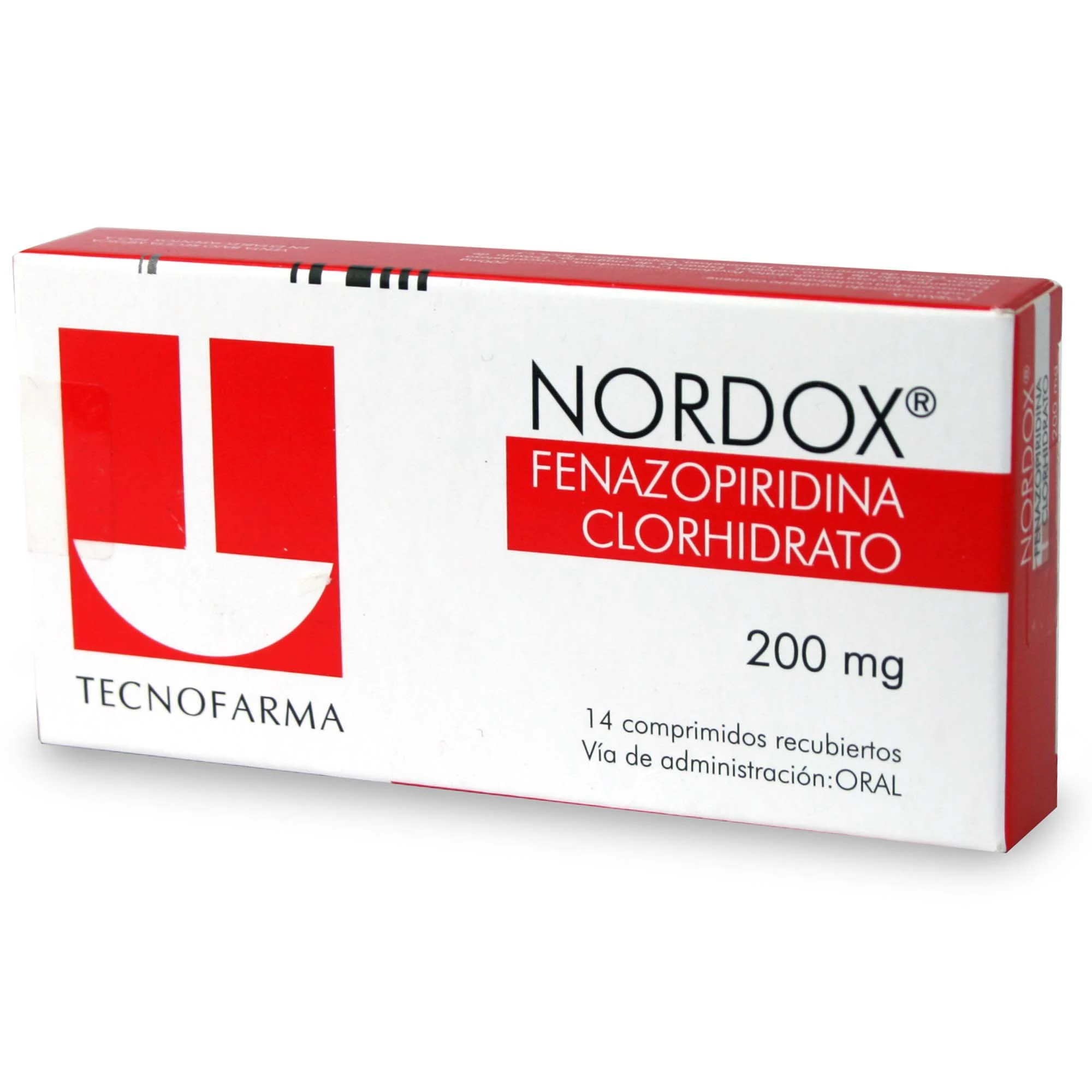 Nordox 200 mg (principio activo Fenazopiridina) en 14 comprimidos es un analgésico urinario utilizado para aliviar síntomas de irritación del tracto urinario, como dolor, ardor y malestar. Su acción es sintomática y complementaria al tratamiento indicado por el profesional de la salud. Uso bajo supervisión médica. Este producto es un medicamento. Su uso puede causar efectos adversos. Consulte a su médico o farmacéutico.