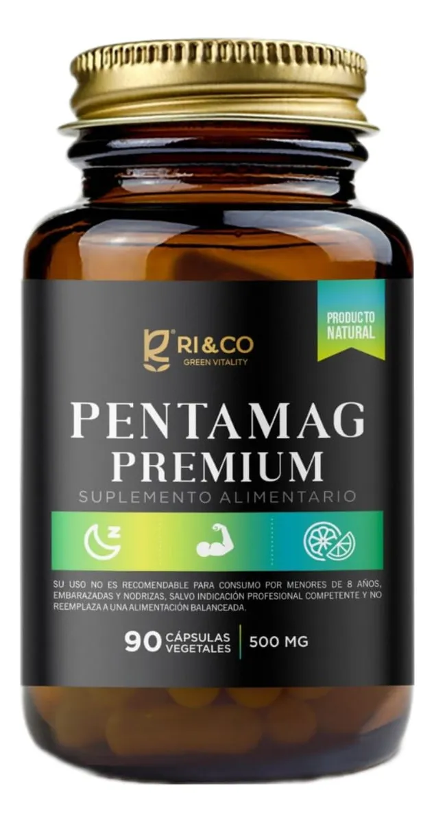 Pentamagnesio Premium RI&CO combina 5 formas de magnesio para una absorción superior. Apoya la relajación muscular, el sistema nervioso y la energía celular. Presentación: 90 cápsulas de 500 mg.