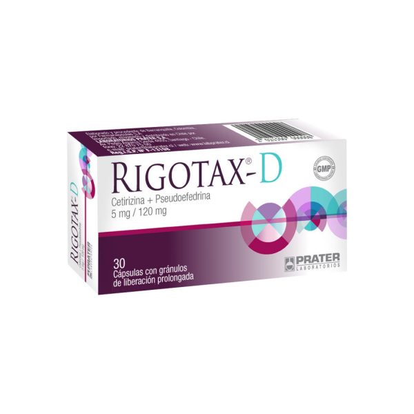 Rigotax‑D 30 cap combina cetirizina y pseudoefedrina para ayudar a aliviar síntomas alérgicos (estornudos, picazón, ojos llorosos) y reducir la congestión nasal asociada. Presentado en cápsulas de uso oral, es una opción integral para abordar diferentes signos respiratorios según indicación médica. Este producto es un medicamento. Su uso puede causar efectos adversos. Consulte a su médico o farmacéutico.