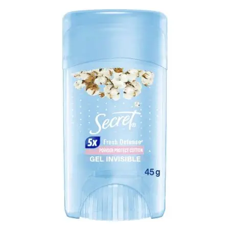 Secret gel Powder Protect Cotton 45 g ofrece protección antitranspirante efectiva con un suave aroma a algodón. Su fórmula en gel se aplica fácilmente, se seca rápido y no deja manchas. Ideal para uso diario femenino.