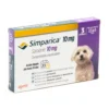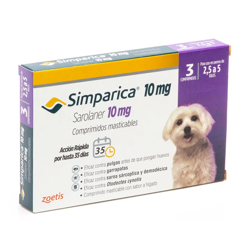 Simparica 10 mg 2,5‑5 kg 3 comprimidos es un medicamento veterinario oral antiparasitario masticable diseñado para perros pequeños (2,5 a 5 kg), indicado para el tratamiento y control de infestaciones por pulgas y garrapatas, así como para ayudar en el manejo de sarna sarcóptica y otros ectoparásitos. Su acción comienza rápido y protege al perro durante semanas. Uso exclusivo veterinario.