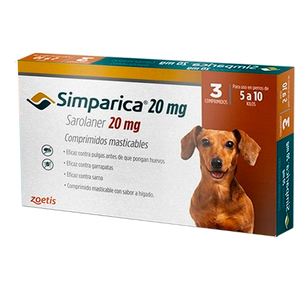 Simparica 20 mg 5‑10 kg 3 comprimidos es un antiparasitario veterinario oral masticable para perros con peso entre 5 y 10 kg, formulado con sarolaner para tratar y ayudar a controlar infestaciones por pulgas y garrapatas. Su formato de 3 comprimidos permite protección mensual continua con una dosis fácil de administrar. Ideal como parte del cuidado preventivo de tu mascota. Uso exclusivo veterinario.