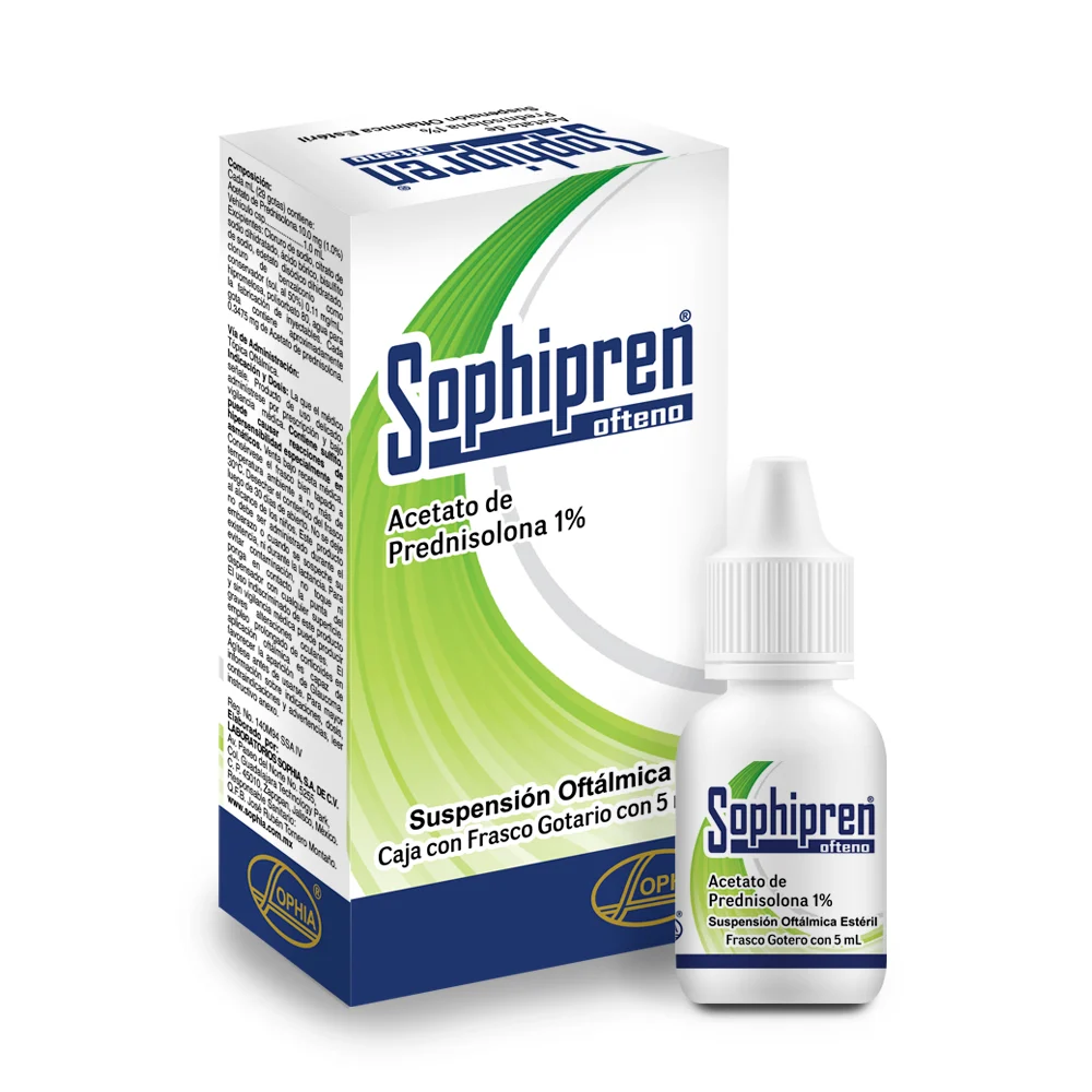 Sophipren Ofteno 1 % suspensión oftálmica contiene acetato de prednisolona como principio activo, un corticosteroide eficaz para el tratamiento de inflamaciones y alergias del ojo que responden a esteroides. Esta formulación en gotas facilita su aplicación directa sobre el segmento anterior del ojo en cuadros inflamatorios, postoperatorios o alérgicos. Uso exclusivamente bajo prescripción médica. Este producto es un medicamento. Su uso puede causar efectos adversos. Consulte a su médico o farmacéutico.