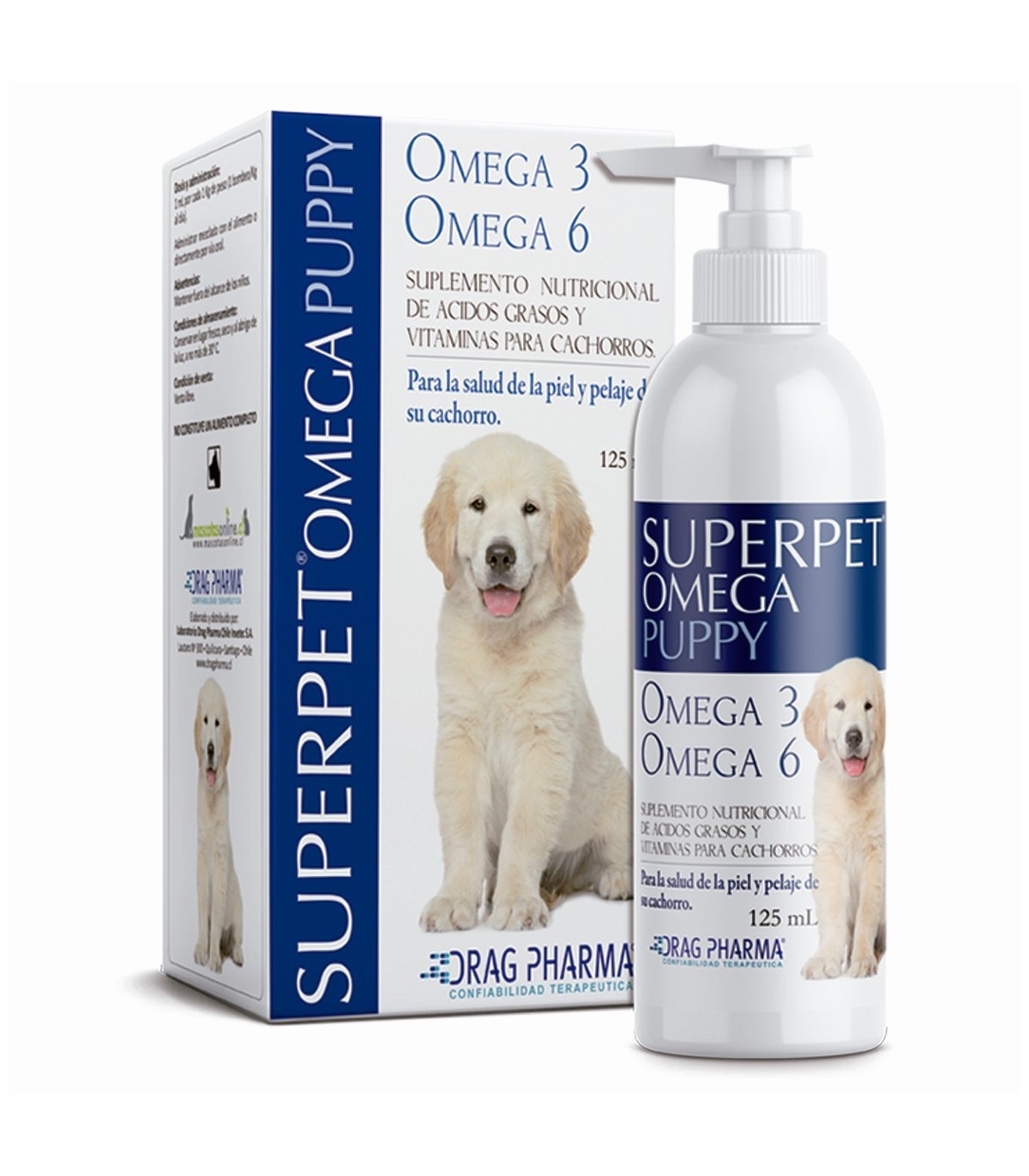 SUPER PET Omega 3‑6 Puppy 125 ml es un suplemento nutricional formulado para cachorros. Aporta ácidos grasos esenciales que favorecen una piel sana, pelaje brillante y contribuyen al desarrollo general durante la etapa de crecimiento. De fácil administración con el alimento.