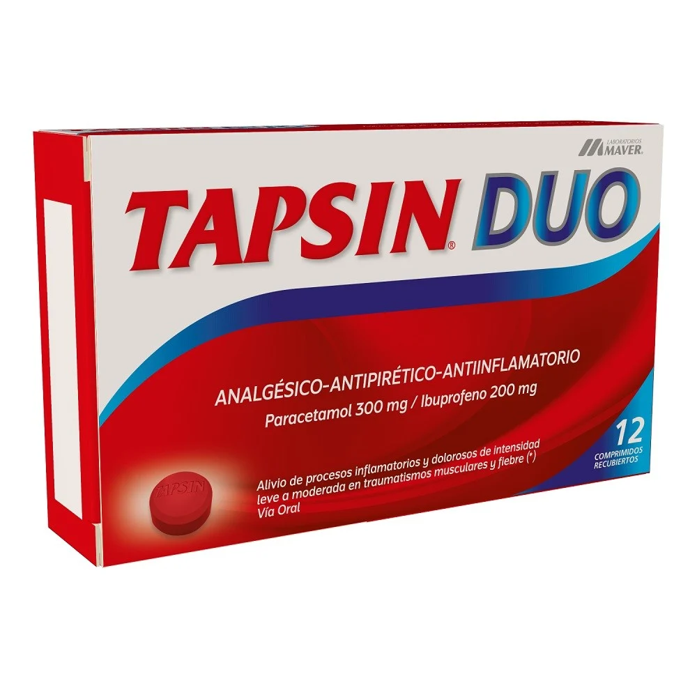 Tapsin Duo 12 comprimidos d combina paracetamol e ibuprofeno para el alivio sintomático de dolores leves a moderados, inflamación y fiebre ocasional. Presentación en comprimidos recubiertos de uso oral.