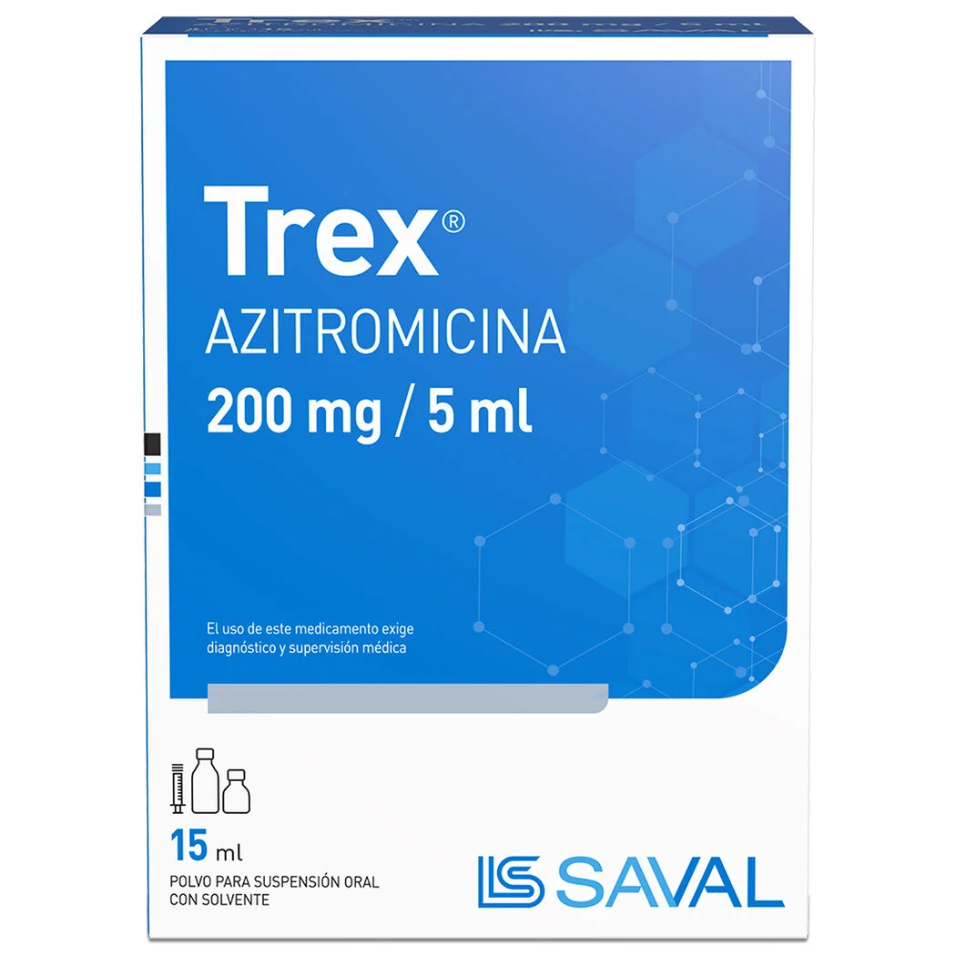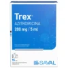 Trex 200 mg/5 ml en suspensión oral contiene azitromicina, antibiótico macrólido indicado en infecciones respiratorias, otitis y amigdalitis en niños. Frasco 15 ml con solvente.