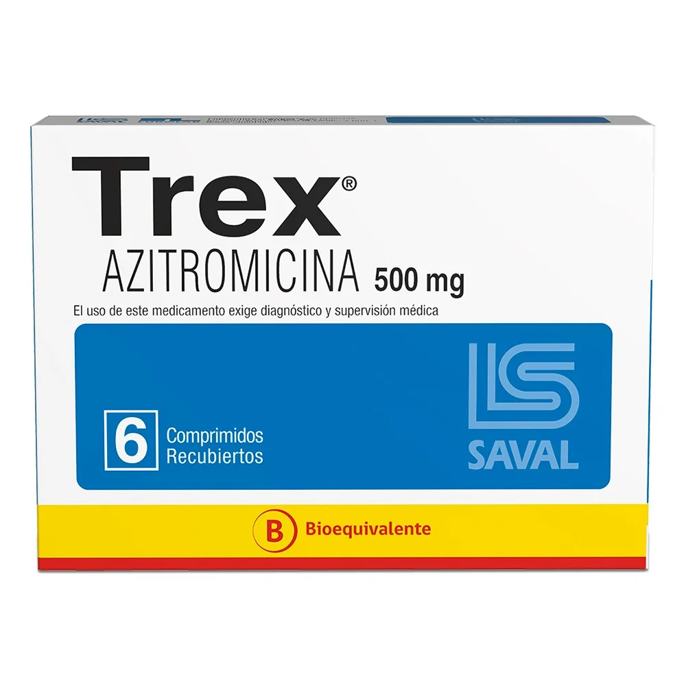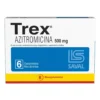 Trex 500 mg contiene azitromicina, antibiótico macrólido eficaz frente a infecciones respiratorias, cutáneas y urogenitales. Caja con 6 comprimidos recubiertos.