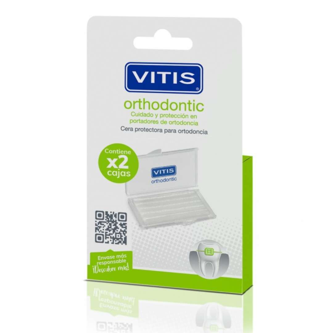 Vitis cera Orthodontic 2×1 protege la mucosa bucal contra heridas causadas por brackets y alambres. Su fórmula moldeable crea una barrera suave que alivia molestias por roce durante el tratamiento de ortodoncia. Pack doble práctico.
